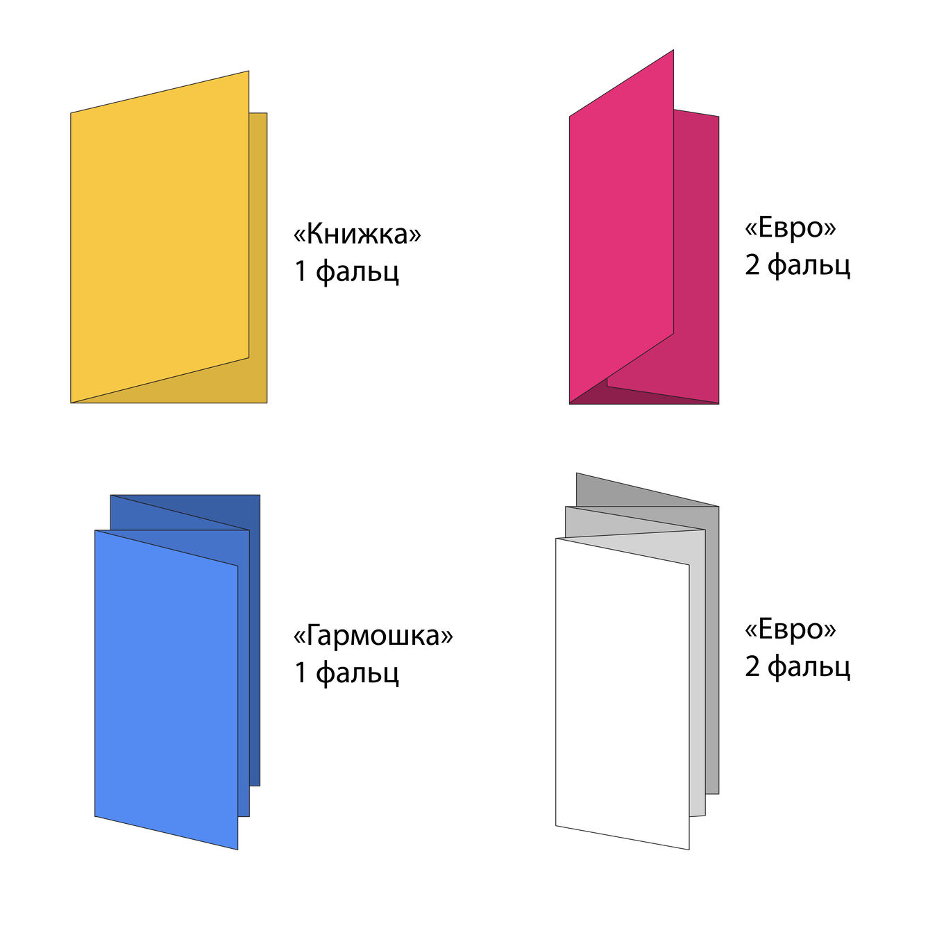 - Биговка и фальцовка (сгибы “книжка”, “гармошка”, “евро”).